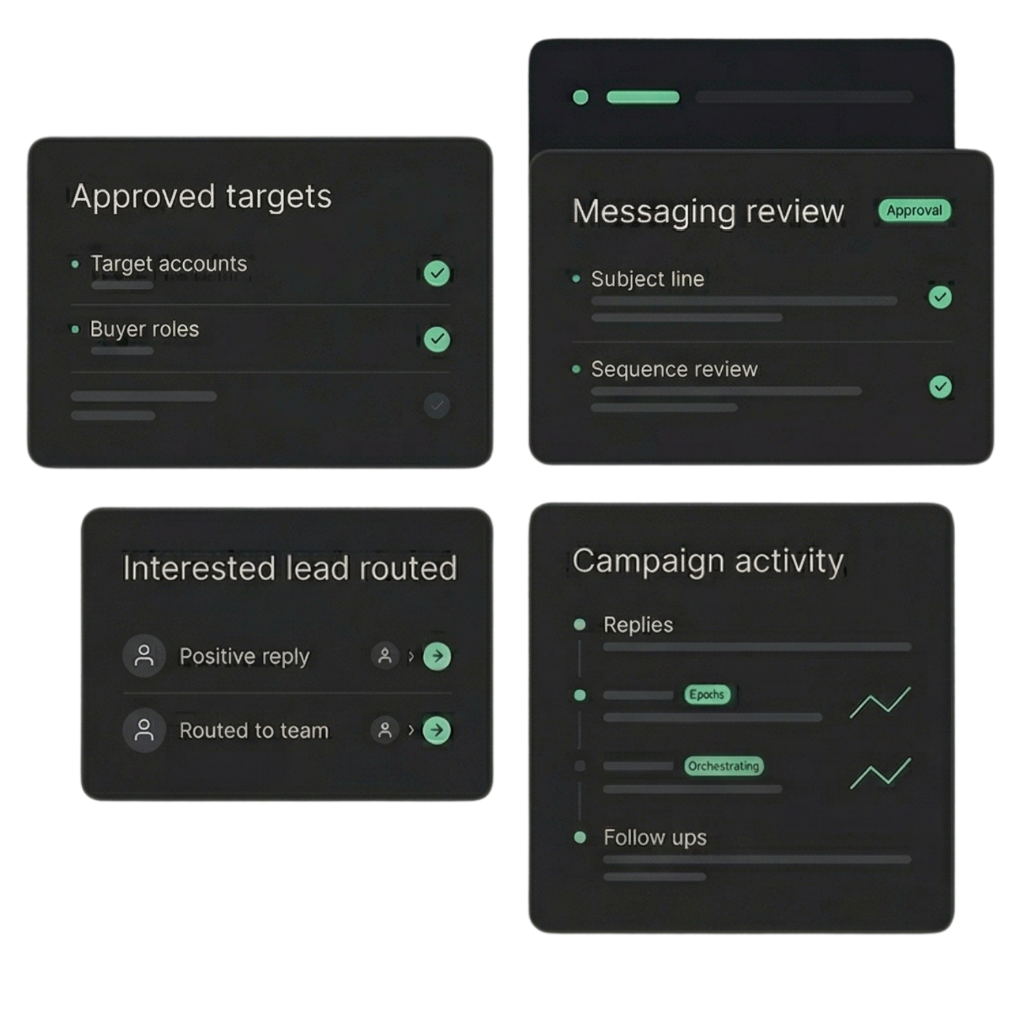 We pressure test your outbound angle, sharpen the offer, and write copy that sounds human and relevant. You approve messaging before launch. Then we iterate based on real replies.